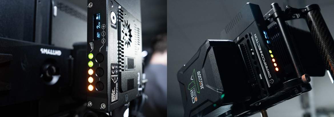 To build a compact focus station, mount the seven-inch SmallHD Indie 7 on a portable adjustable stand. We used an ARRI 050KA combined with a grip head and a Manfrotto 013 spigot. The grip head allows the monitor to be adjusted to almost any position. Mount the DwarfConnection receiver in the cage, keep cable management tidy, and use angled SDI cables. To save time during battery changes, connect all D-tap cables to the V-mount breakout plate on the back of the monitor.