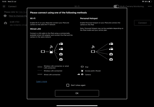 Make sure your camera shows up on the multi camera connection screen of the app: